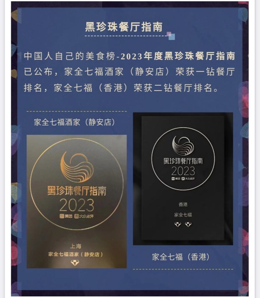 家全七福香港店及靜安店繼續蟬聯上榜美團“2023黑珍珠餐廳指南”